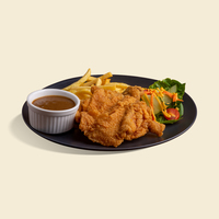 Classic chicken chop (junior) in delicious coating serve with fries, vegetables, served with black pepper gravy