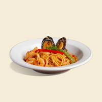 Spaghetti pasta cooked with garlic, chili flakes and secret season sauce, served with seafood