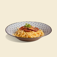 Linguine pasta cooked with carbonara sauce and served with salami slices